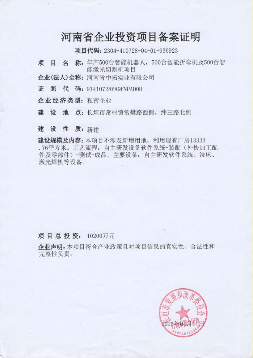 大圣智能折彎?rùn)C(jī),機(jī)械臂,激光切割機(jī)工廠(chǎng)備案證明